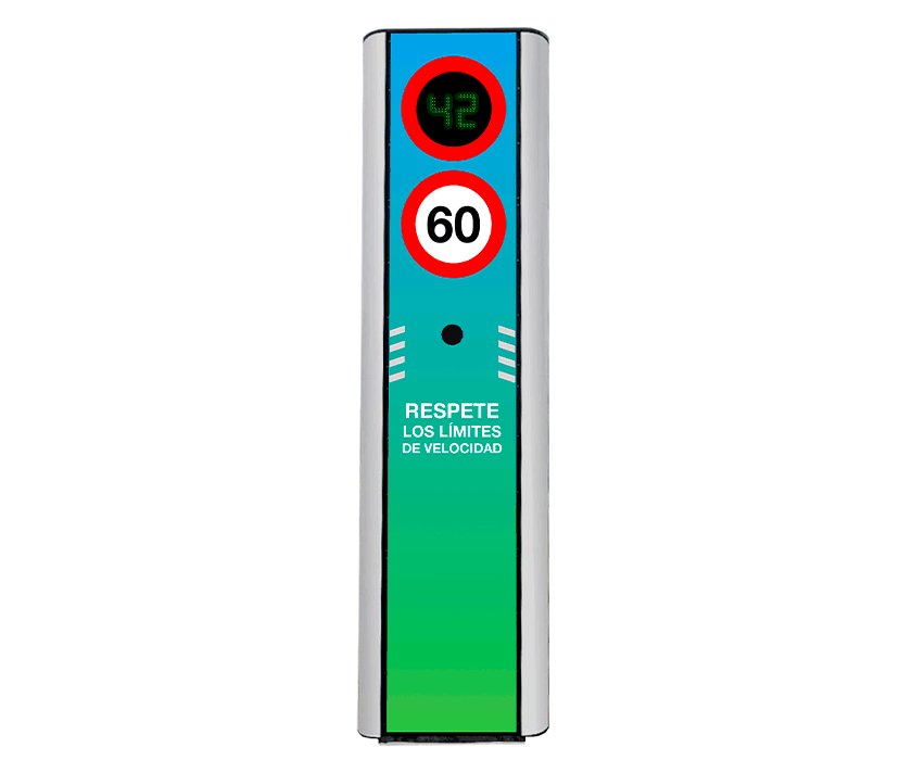 Los Tótems Indicadores de Velocidad de Vialseg miden la velocidad de desplazamiento del vehículo que se acerca a una distancia, regulable, de hasta 200 metros, mostrándola en un display LED muy visible.